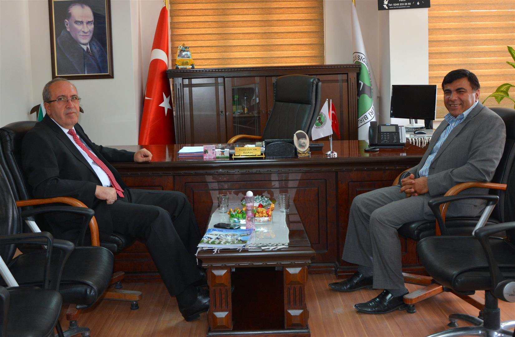 Burdur Emniyet Müdürü Eyüp Özdoğru, Burdur İli Damızlık Sığır Yetiştiricileri Birliği (DSYB) Yönetim Kurulu Başkanı Kamil Özcan’ ı makamında ziyaret etti. Başkan Özcan Emniyet Müdürü Eyüp Özdoğru’ya Birliğin yapısı ve çalışmaları hakkında bilgi verdi. Ziyarette hayvan hırsızlıklarıyla mücadele de konuşuldu.